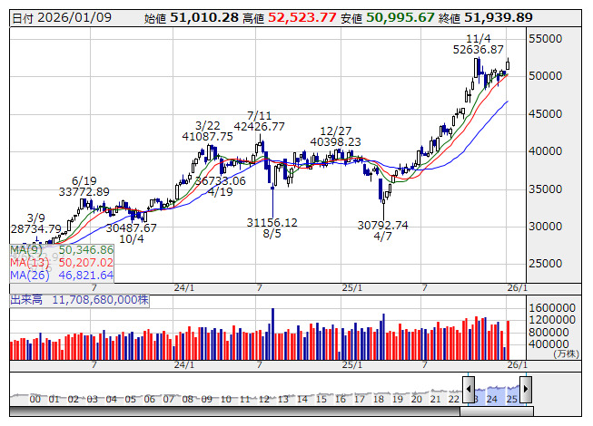 日経平均 51939.89( +822.63) 売買高22億9736万株 売買代金 6兆2881億円
