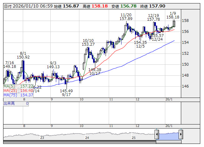 米ドル/円 <日足> 「株探」多機能チャートより9日のニューヨーク外為市場でドル・円は157円36銭へ下落後、158円18銭まで上昇し、157円93銭で引けた。米12月雇用統計で雇用者数の伸びが予想を下回り一時ドル売りが強まったのち、失業率の低下や平均時給の上昇、さらにミシガン大消費者信頼感指数も予想を上回ったためドル買いに拍車がかかった。高市首相が衆院解散を検討との報道で円売りも強まった模様。