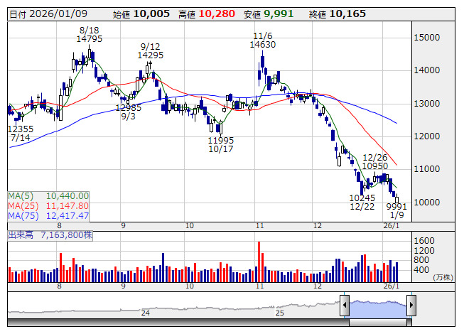 政治とカネの問題が自民党への不信感に繋がり、2026年はそれらの反省を活かして使途の透明化や無駄の削減が推進されると良いですねぇ。個人投資家としては、NISAの非課税アピールをする代わりにNISA口座以外の利益に増税するなんて事が起こらないよう願っております。昨今の投資ブームで単元未満の少額投資で大型の有名企業に投資する若者も増えているようで、売られ過ぎでも反発期待の根強いテーマを持つ銘柄であれば決算を目安に相場は続く可能性が高いのではないでしょうか。