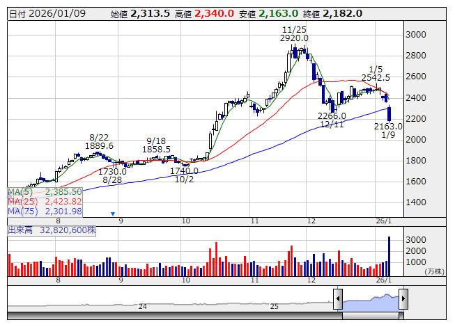 イオン <日足> 「株探」多機能チャートより―決算で売られた銘柄! 下落率ランキング―