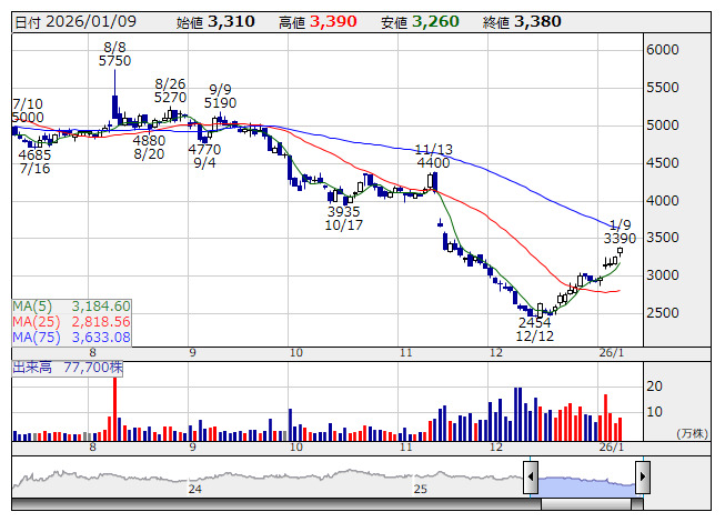 Arent <日足> 「株探」多機能チャートより――――――――――――――――――― 1月 5日 (月) 発表分――