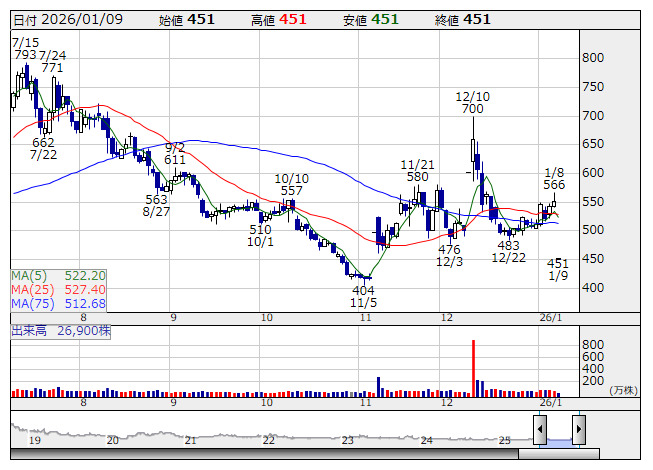 デルタフライ <日足> 「株探」多機能チャートより■デルタフライ <4598> 451円 (-100円、-18.2%) ストップ安