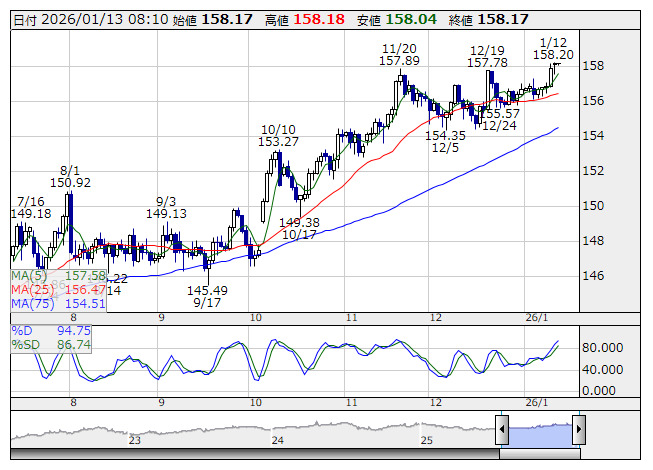 米ドル/円 <日足> Slowストキャス 「株探」多機能チャートより12日の米ドル・円は、東京市場では158円20銭から157円52銭まで下落。欧米市場では157円68銭まで下げた後、158円20銭まで反発し、158円16銭で取引終了。本日13日の米ドル・円は主に158円台で推移か。日本の財政悪化が引き続き警戒されており、米ドル買いは継続する可能性がある。