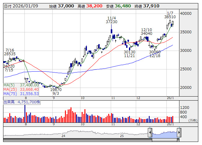 2026年01月13日08時33分 【テク】東エレク---24年4月につけた最高値が射程に 東エレク <日足> 「株探」多機能チャートより <8035> 東エレク - - 7日に38510円まで買われ、昨年来を更新。その後は調整をみせたものの、ボリンジャーバンドの+2σを下回ったことで、短期的な過熱感は和らいでいる。+3σは40170円辺りに位置しており、同バンドを捉えてくるようだと過熱感が警戒されるものの、24年4月につけた最高値(40860円)が射程に入ってくるなかで、押し目買い意欲は強そうである。 《FA》 提供:フィスコ
