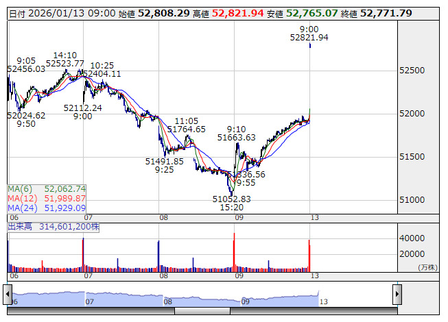 2026年01月13日09時02分 【市況】日経平均13日寄り付き=868円高、5万2808円 日経平均 <5分足> 「株探」多機能チャートより 13日の日経平均株価は前日比868.40円高の5万2808.29円で寄り付いた。 株探ニュース