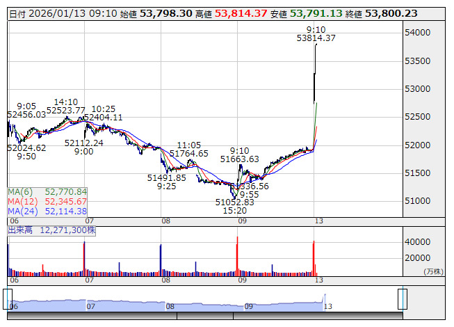 2026年01月13日09時11分 【市況】日経平均の上げ幅が1800円突破 日経平均 <5分足> 「株探」多機能チャートより 日経平均株価の上げ幅が1800円を突破。9時10分現在、1874.48円高の5万3814.37円まで上昇している。 株探ニュース