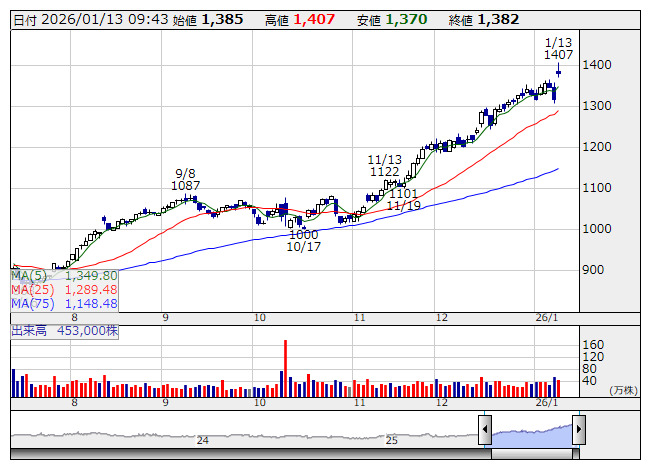 乃村工芸社 <日足> 「株探」多機能チャートより
