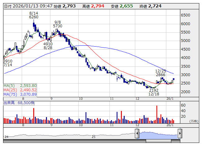 2026年01月13日09時46分 【材料】ユトリは底堅い、12月月次で高い伸び続く ユトリ <日足> 「株探」多機能チャートより yutori<5892>は底堅く推移している。前週末9日取引終了後に月次KPIを発表。2025年12月の全社売上高は前年同月比40.4%増と高い伸びを続けた。気温の低下で冬物の販売が好調に推移した。ブランド別では「9090」「Her lip to」「minum」が引き続き牽引した。これが好感されている。 出所:MINKABU PRESS
