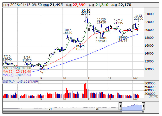 アドテスト <日足> 売買代金 「株探」多機能チャートより高市早苗首相が衆院解散の検討に入ったことが明らかとなり、これを好感する形で日経平均は先物主導で急浮上する展開となっており、指数寄与度の大きいアドテストや東エレクなどを中心に半導体セクターはリスクオンの象徴として買いを呼び込んでいる。米国株市場では半導体銘柄で構成されるフィラデルフィア半導体株指数(SOX指数)が週明けに史上最高値を更新しており、これも東京市場に追い風となっている。
