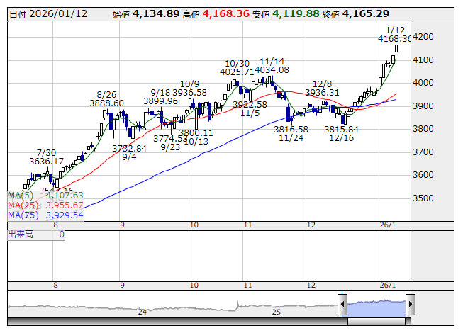 2026年01月13日10時52分 【市況】13日中国・上海総合指数=寄り付き4169.7041(+4.4171) 上海総合 <日足> 「株探」多機能チャートより 13日の中国・上海総合指数は前営業日比4.4171ポイント高の4169.7041で寄り付いた。 出所:MINKABU PRESS
