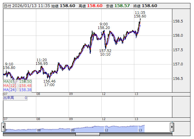2026年01月13日11時39分 【通貨】東京為替:米ドル・円は158円58銭まで再上昇 米ドル/円 <5分足> 「株探」多機能チャートより 13日午前の東京市場でドル・円は158円50銭台で推移。157円90銭まで売られた後、158円58銭まで反発。ユーロ・ドルは1.1671ドルから1.1657ドルまで値下がり、ユーロ・円は184円54銭から184円26銭まで下げた後、184円88銭まで反発。 《MK》 提供:フィスコ