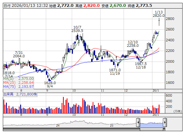 6323>が続騰し、昨年来高値を更新している。同社は前営業日となる9日の取引終了後、26年2月期第3四半期累計(3~11月)の連結決算を発表。売上高は前年同期比5.9%増の944億8300万円、経常利益は同12.7%減の233億7500万円となった。9カ月間では経常減益となったものの、直近3カ月間の9~11月期で経常利益は42%の大幅増益となり、評価されたようだ。中間期と比較して第3四半期累計の為替差損は縮小した。通期業績予想は据え置いたものの、第4四半期以降、来期に向け半導体製造工程向けの主要搬送装置の受注や売り上げは増加する見込みだとしている。