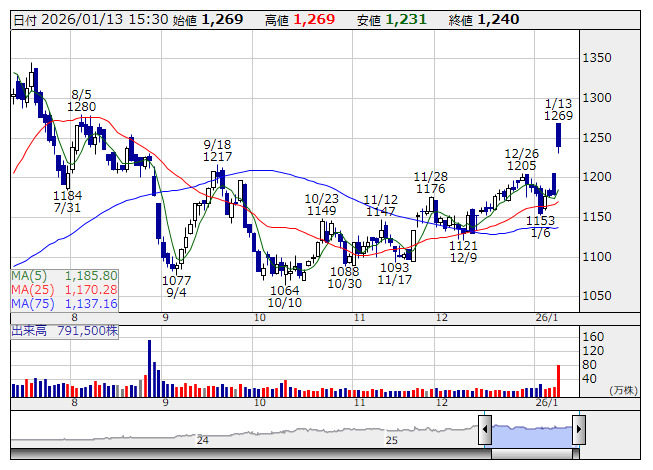 住友金属鉱山<5713>が大幅続伸し最高値。ニューヨーク商品取引所(COMEX)で12日に金先物2月物が、前週末比113.8ドル高の1トロイオンス=4614.7ドルに上昇。一時、4640.5ドルと約2週間ぶりに最高値を更新した。パウエル米連邦準備制度理事会(FRB)議長が米司法省の刑事捜査の対象となっていることが判明したが、同議長は強く反発しており、FRBの独立性の維持が懸念されるなか安全資産の金への買いが膨らんだ。また、イランで政府に対する抗議デモが広がるなど、地政学リスクの高まりも金の買い要因となった。金鉱山を保有する住友鉱が買い人気となっており、金を販売する三菱マテリアル<5711>も大幅に値を上げている。