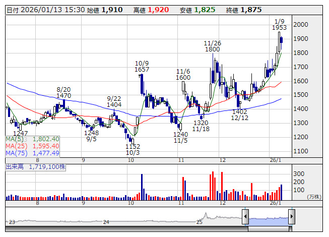 2026年01月13日16時06分 【材料】ノートの26年11月期は連続最高益へ、AI関連事業の貢献見込む ノート <日足> 「株探」多機能チャートより note<5243>はこの日の取引終了後、26年11月期連結業績予想について売上高を56億円(前期比35.2%増)、営業利益を7億円(同2.7倍)と発表した。黒字転換した24年11月期から急拡大路線をたどり、3期連続となる最高益更新を狙う。 主力の「note」「note pro」が強固な収益基盤として引き続き成長を牽引する見通し。AI関連事業の売り上げ貢献も見込む。配当予想は無配継続とした。なお、同時に発表した25年11月期決算は売上高が41億4100万円(前の期比25.0%増)、営業利益は2億5600万円(同4.8倍)だった。 出所:MINKABU PRESS