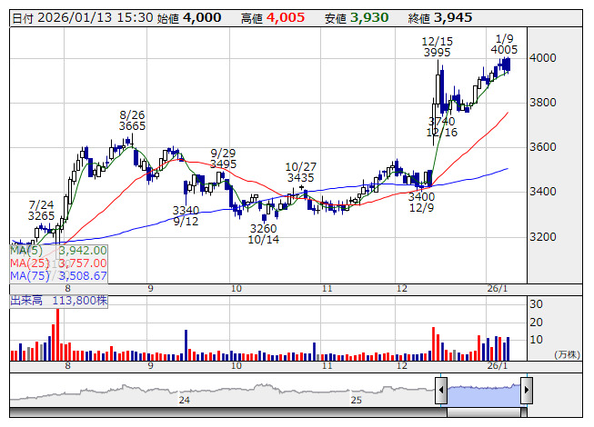 2026年01月13日16時22分 【材料】トーホーが141万3400株の売り出しと1株から3株への株式分割を発表 トーホー <日足> 「株探」多機能チャートより トーホー<8142>がこの日の取引終了後、既存株主による141万3400株の売り出しを行うと発表した。売出価格は1月21日から23日までの期間に決定される予定で、受け渡し期日は価格決定日の3営業日後。株式の流動性の向上及び個人投資家を中心とした株主層の更なる拡大を図ることが狙いとしている。 同時に、1月31日を基準日として1株を3株に株式分割すると発表した。投資単位当たりの金額を引き下げることで、投資家がより投資しやすい環境を整え、株式の更なる流動性の向上と投資家層の拡大を図ることが目的という。 出所:MINKABU PRESS