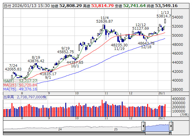 日経平均 <日足> 「株探」多機能チャートより日本取引所が公表した先物手口情報によると、1月13日の日経225先物期近(2026年3月限)の夜間取引(立会内・J-NETの合算)で、取引高トップはABNクリアリン証券の2万1246枚だった。
