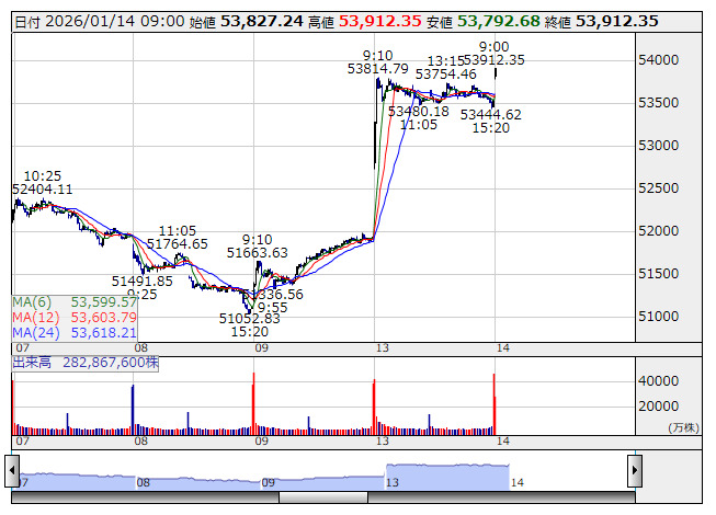 2026年01月14日09時02分 【市況】日経平均14日寄り付き=278円高、5万3827円 日経平均 <5分足> 「株探」多機能チャートより 14日の日経平均株価は前日比278.08円高の5万3827.24円で寄り付いた。 株探ニュース