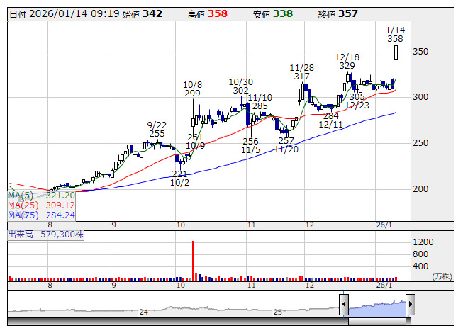 3236>が上値指向鮮明、カイ気配スタートで300円近辺のもみ合いを一気に上放れる動きをみせている。首都圏を中心にマンション開発を手掛けており、26年5月期は営業4割強の減益を見込んでいたが、会社側予想は上方修正される可能性が高いとみられている。13日取引終了後に発表した26年5月期上期(25年6~11月)業績は営業利益が前年同期比31%増の23億5900万円と通期予想の19億2500万円を大幅に超過した。賃貸開発事業が好調なほか、中古マンション再生のバリューアップ事業も保有物件の売却が進み収益に貢献している。足もとの好決算を評価する買いを引き寄せた。