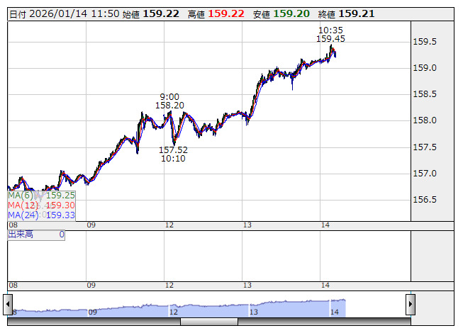 米ドル/円 <5分足> 「株探」多機能チャートより14日午前の東京市場でドル・円は159円20銭台で推移。159円10銭から159円45銭まで買われており、欧米市場にかけて159円台後半まで一段高となる可能性は残されている。ユーロ・ドルは1.1646ドルから1.1636ドルまで値下がり、ユーロ・円は185円20銭から185円57銭まで反発し、直近では185円40銭台で推移。