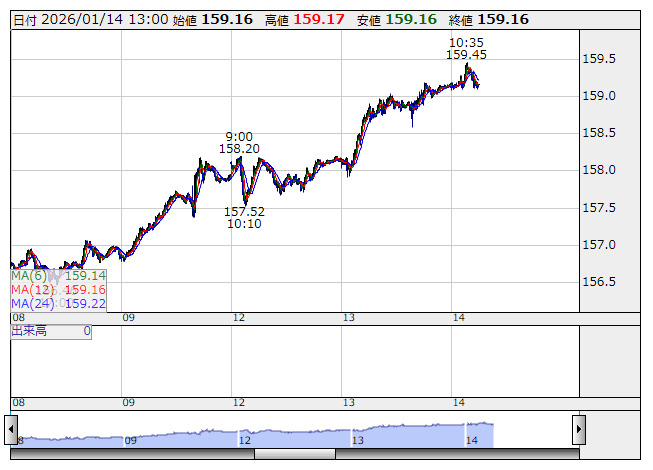 2026年01月14日13時01分 【通貨】外為:1ドル159円16銭前後とドル高・円安で推移 米ドル/円 <5分足> 「株探」多機能チャートより 14日の外国為替市場のドル円相場は午後1時時点で1ドル=159円16銭前後と、前日午後5時時点に比べ22銭のドル高・円安。ユーロ円は1ユーロ=185円37銭前後と2銭のユーロ安・円高と横ばい圏で推移している。 株探ニュース