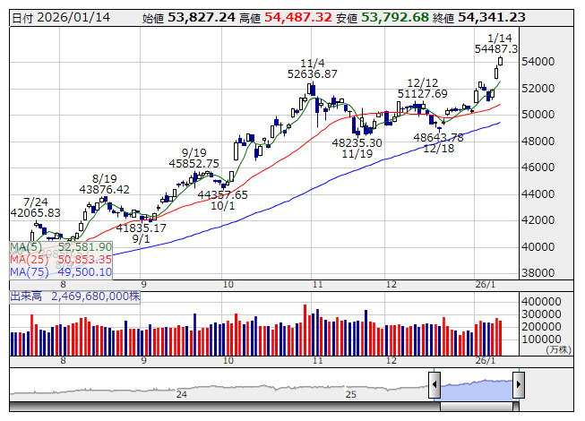 MSFT>など下値を探る展開を余儀なくされた。東京市場では週明けから衆院解散観測を背景に日経平均やTOPIXが急速に上値を追う展開となっていたが、きょうは反動安が想定される。高市早苗首相は14日、23日に召集される通常国会冒頭での衆院解散に踏み切る意向を伝達し、19日の記者会見で正式表明する見通しとなったが、これについては既にマーケットは織り込んでいたことで、改めて株価を刺激する展開は期待しにくい。ただ、個別株は高市トレードの流れで物色人気が継続しそうで、これが全体相場を下支えすることも考えられる。