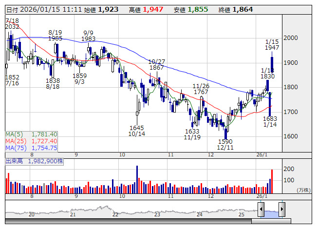 4443>は大幅反発。前日に第2四半期の決算を発表、9-11月期調整後営業利益は24.5億円で前年同期比3.9倍となった。上半期は30.2億円で同3.7倍となり、市場予想の2倍近い水準となっている。Sansan事業の契約件数が順調に増加しているほか、BillOneの収益改善も続いているもよう。通期計画レンジ68.5-86.4億円は据え置いているが、足元の想定以上の収益改善をポジティブに捉える動きが優勢のようだ。