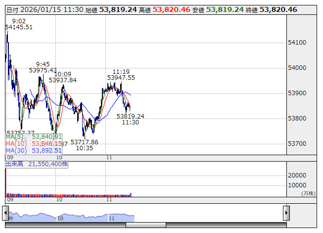 【市況】日経平均15日前引け=4日ぶり反落、520円安の5万3820円