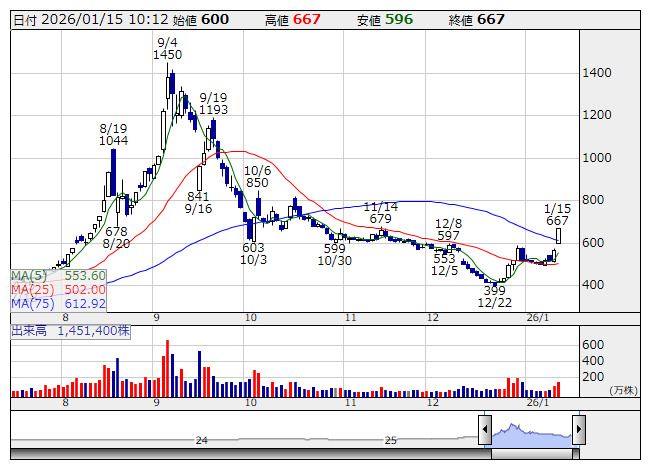 大盛工業 <日足> 「株探」多機能チャートよりMERF<3168>=物色人気集中。時価は昨年来高値圏を走っているが、中長期波動では24年7月につけた823円の高値が上値ポイントとして意識され、きょうはここを気配値のまま通過する公算が大きい。銅を中心とするスクラップとインゴットの回収・販売を手掛ける。業績は米子会社のインゴット販売が好調に推移し業績に寄与している。また、銅市況の高騰を背景にインゴット・リサイクル原料ともに採算が大幅に向上し、収益を押し上げる格好となった。14日取引終了後に発表した26年8月期第1四半期(25年9~11月)決算は、営業利益が7億3700万円(前年同期実績は1400万円)と急拡大し、通期予想の7億4400万円(前期比6.4倍)にほぼ到達する水準となった。これがポジティブサプライズとなり、上値を見込んだ投資資金が一気に流れ込む格好となっている。