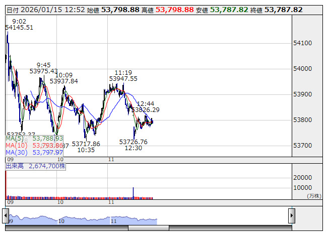 米株式市場の動向を横目に、15日の日経平均は301.83円安の54039.40円と反落して取引を開始した。寄付き後は前日の米国の地政学リスク・株安を受けて売りが先行したものの、為替市場での円安基調や商品価格の上昇が下支え要因となり、午前中は下値を切り上げる展開となった。景気関連株や資源セクターに買い戻しが入り、取引開始後しばらくは戻り歩調となったが、世界的なリスクオフの動きから警戒感も残存し、方向感に欠ける展開が続いた。投資家は需給確認の動きを強める一方、為替の動向や海外指標の発表を注視する動きがみられた。